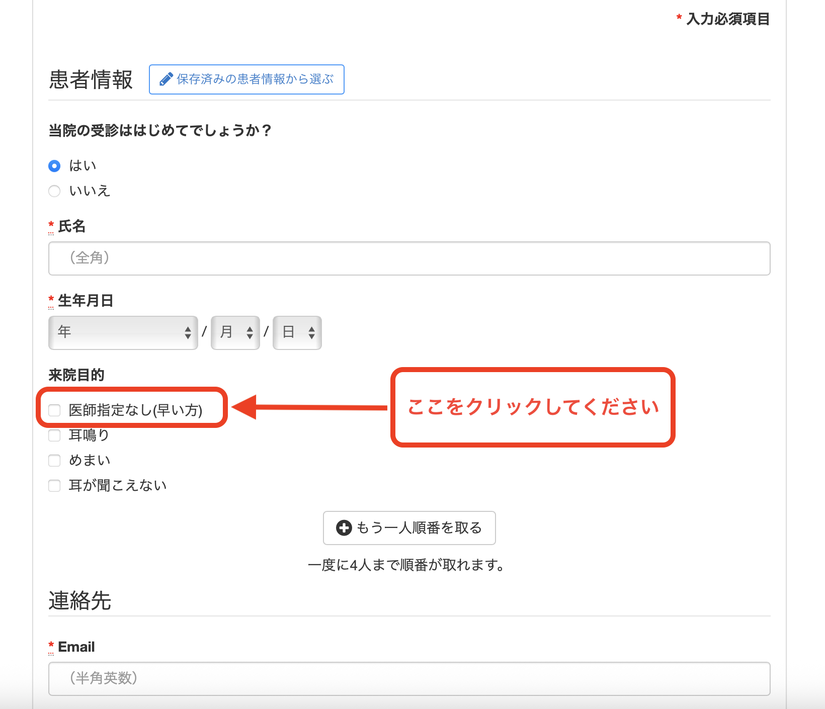 来院目的の医師希望なし(早い方)をチェックください